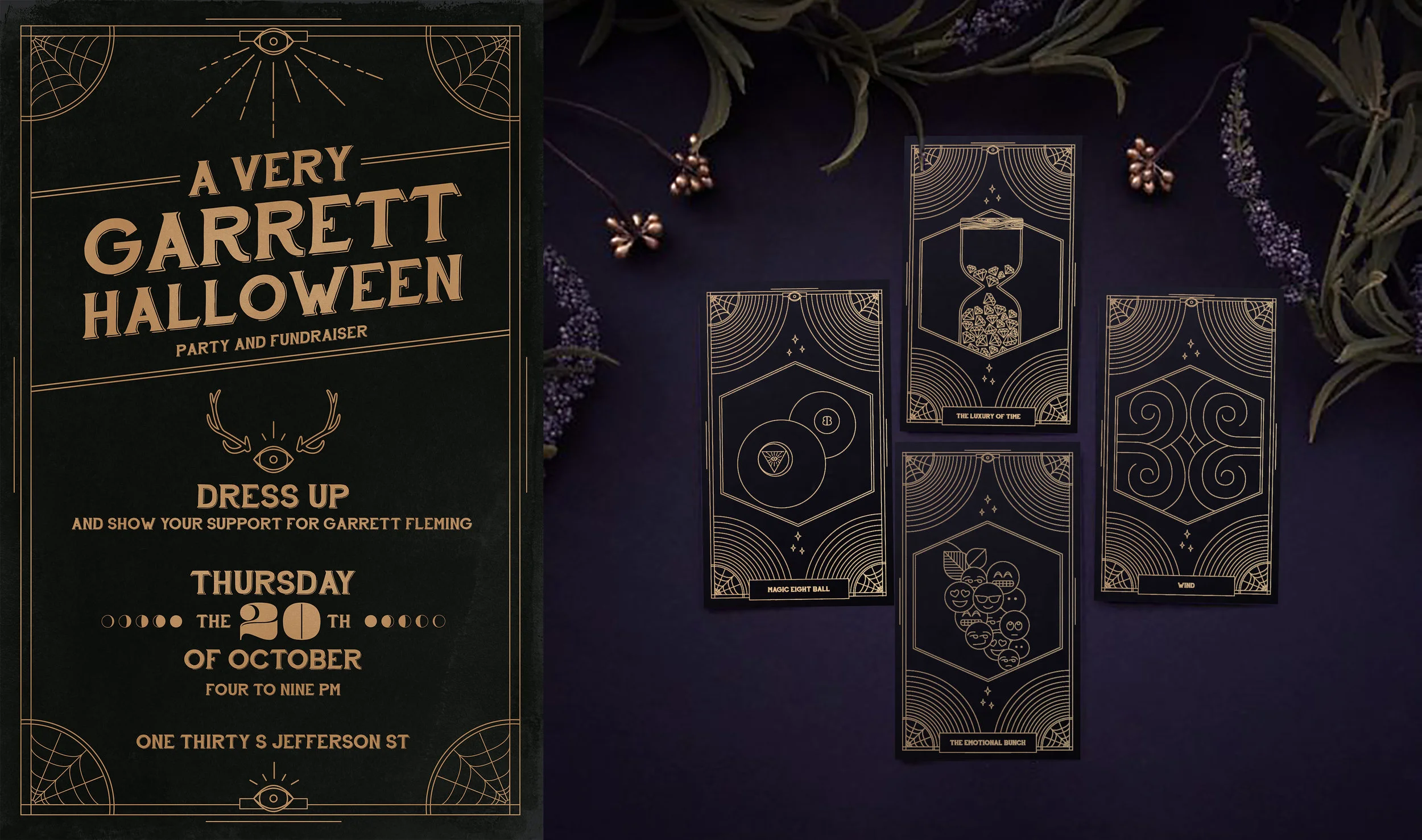 Invitation and satirical tarot cards designed for a Halloween themed benefit